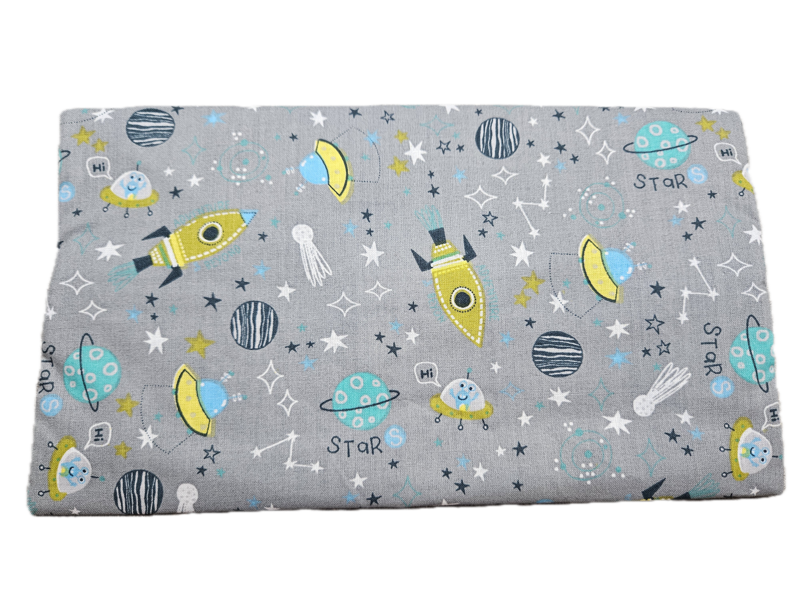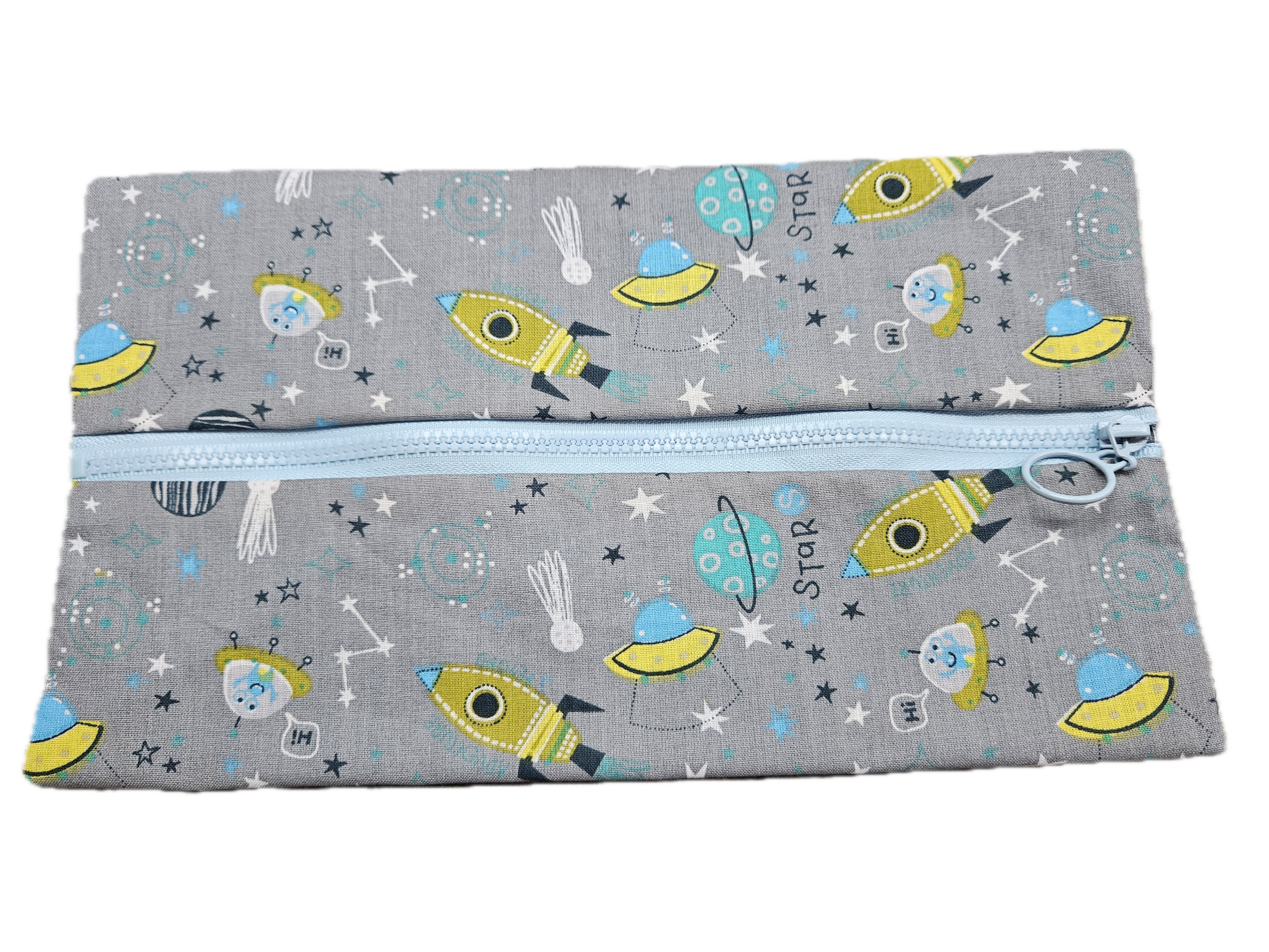 Diese handgenähte Pinsel- und Stiftetasche überzeugt mit einem fröhlichen Weltraum-Motiv. Auf grauem Stoff sind Raketen, Planeten, Sterne und kleine Figuren in Blau-, Gelb- und Weißtönen zu sehen. Das Design wirkt verspielt und modern zugleich und ist ideal für Kinder, Jugendliche und Weltraum-Fans.