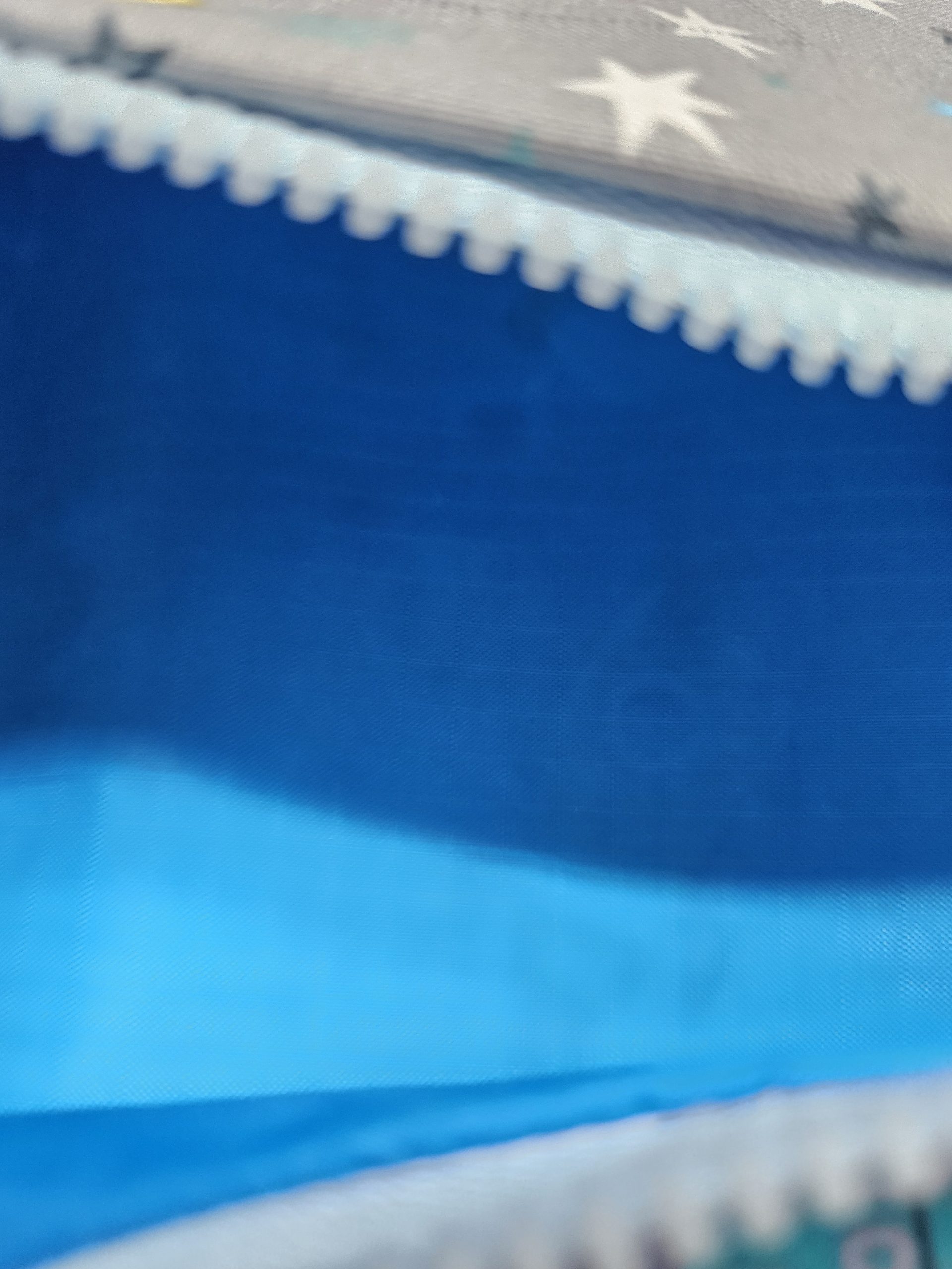 Die Tasche ist innen mit blauem Stoff gefüttert, sauber verarbeitet und angenehm stabil. Der Reißverschluss sorgt für ein sicheres Verstauen und leichtes Öffnen.