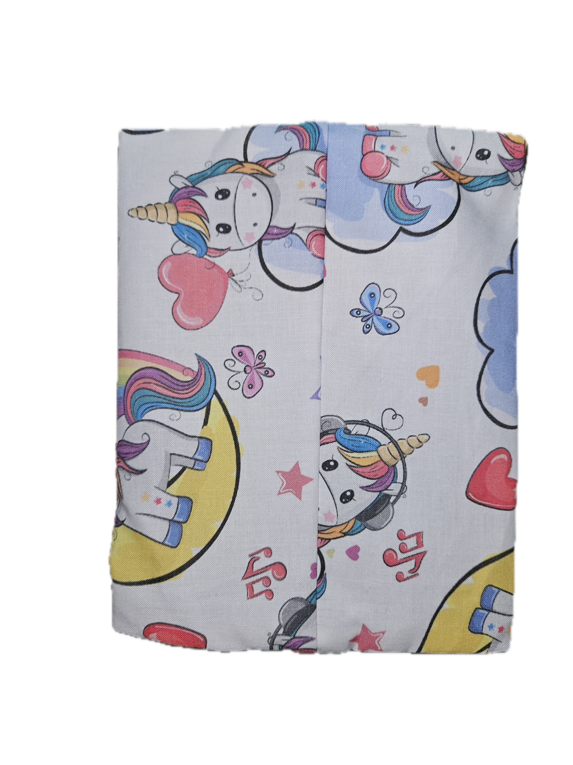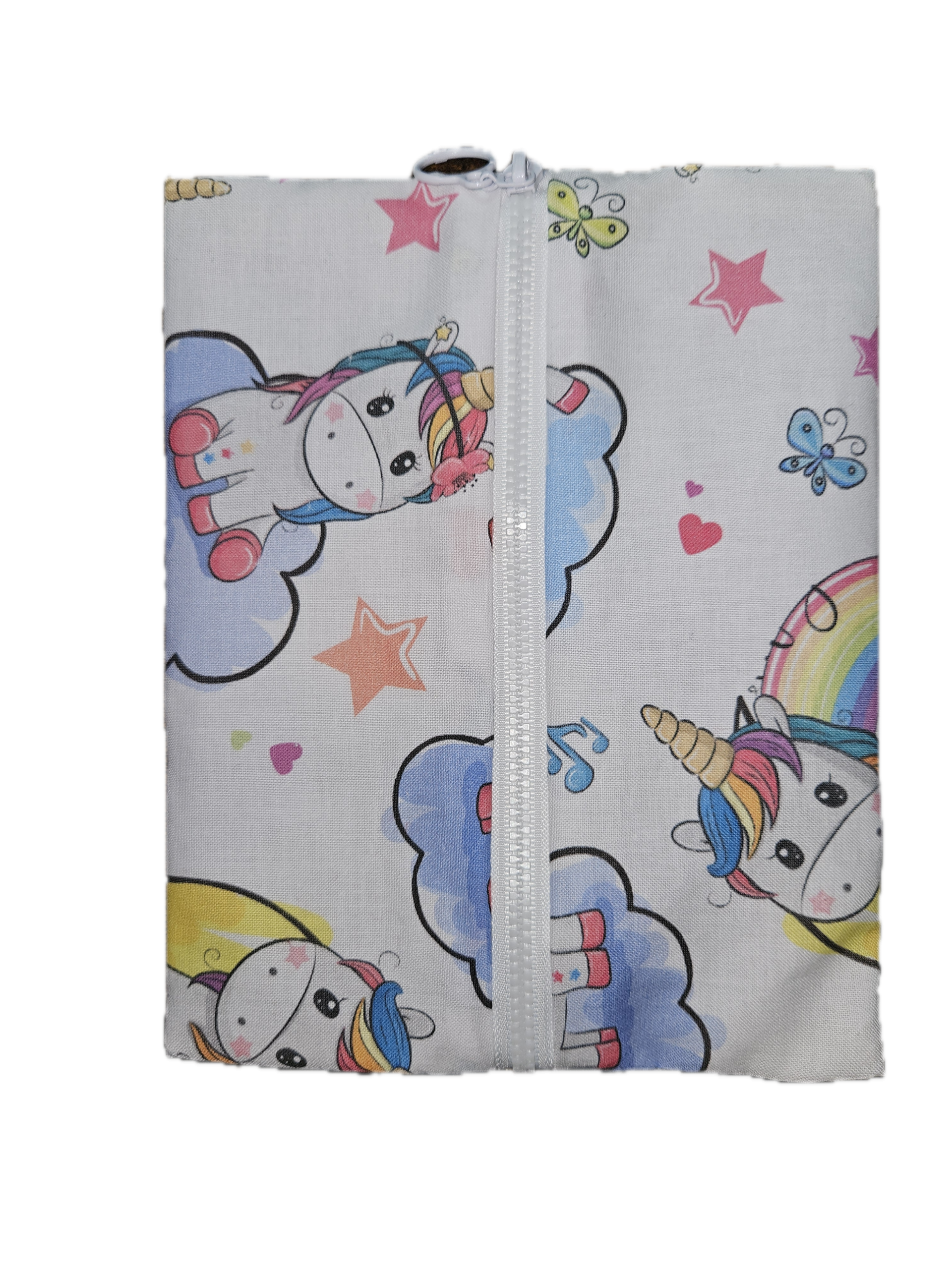 Diese handgenähte Tasche überzeugt mit einem fröhlichen Einhorn-Motiv in bunten Pastellfarben. Einhörner auf Wolken, kleine Herzen, Sterne und verspielte Details machen sie zu einem echten Hingucker.